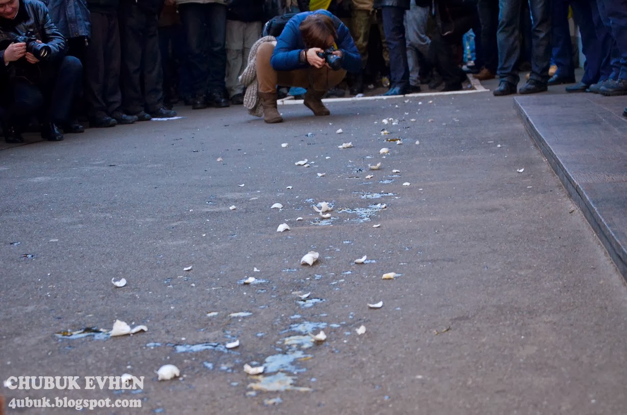 А там летіли яйця. В кінці мітингу примішення МВС підварбували у жовтий колір.